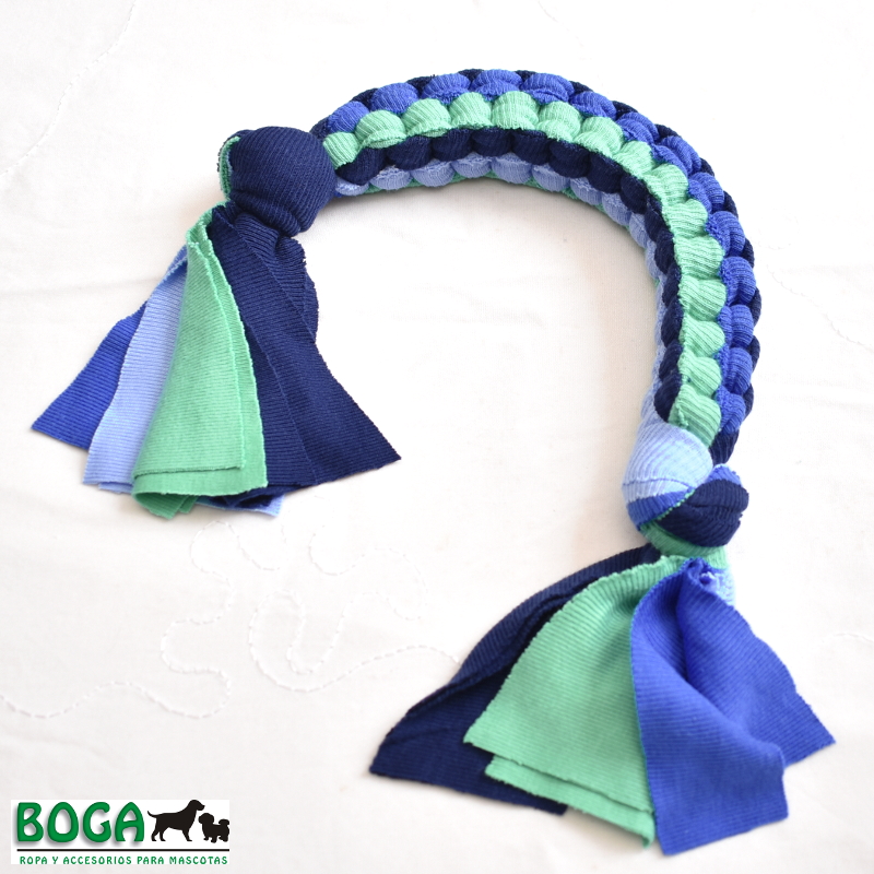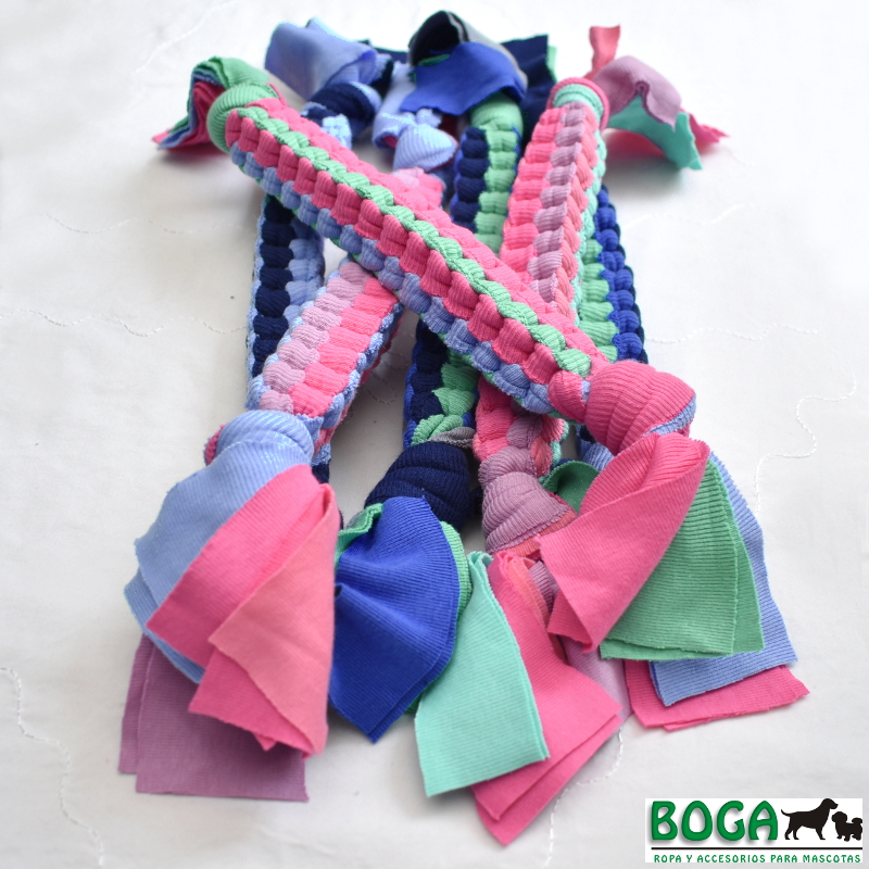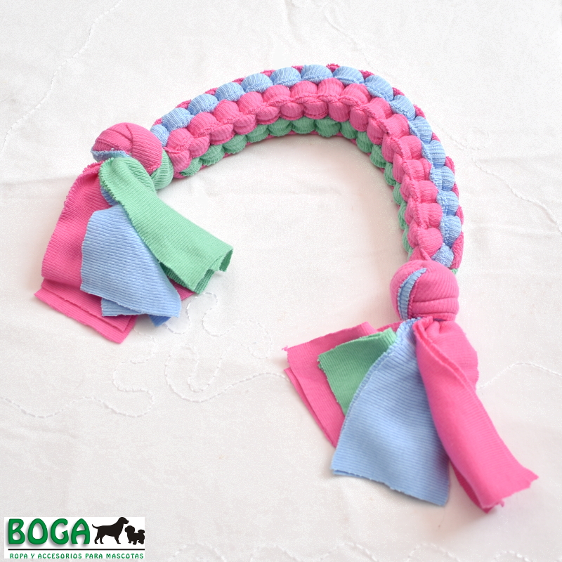 Juguete artesanal trenzado a mano, de algodón hipoalergénico. Flexible, suave con sus dientes y resistente al mismo tiempo. Puedes meterlos a la lavadora para asegurarte que siempre huelan rico.