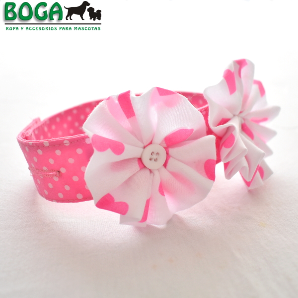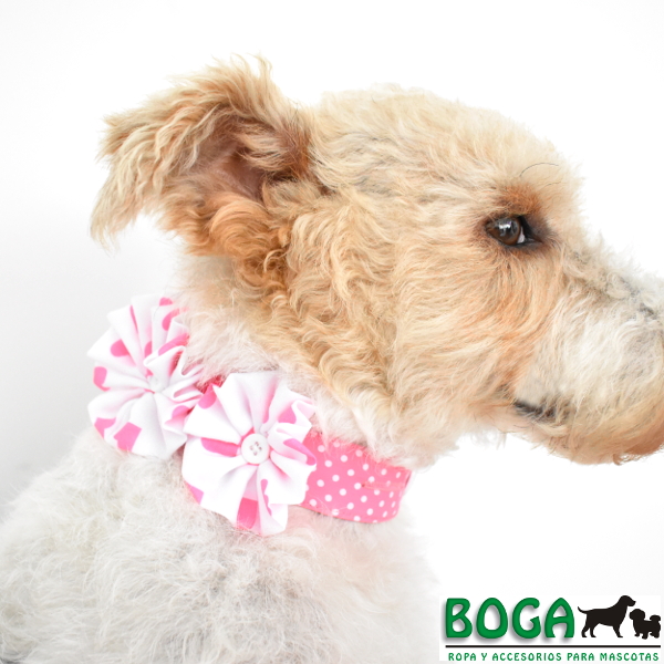 Dulce collar de tela rosada con puntos blancos con un par de flores de corazones fucsias. Ideal para las celebraciones del mes del amor. Disponibles en 4 tallas, ajustables con 3 botones a lo largo para que se acomoden mejor al cuello de tu engreído. Medidas referenciales: 'S' para cuellos de 17 a 27cm, 'M' de 24 a 34cm, 'L' de 33 a 46cm, 'XL' de 44 a 56cm.