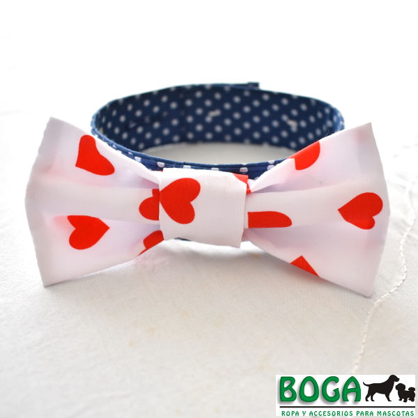 Lindo collar de tela azul con puntos blancos y una corbatita michi de corazones rojos. Ideal para las celebraciones del mes del amor. Disponibles en 4 tallas, ajustables con 3 botones a lo largo para que se acomoden mejor al cuello de tu engreído. Medidas referenciales: 'S' para cuellos de 17 a 27cm, 'M' de 24 a 34cm, 'L' de 33 a 46cm, 'XL' de 44 a 56cm.