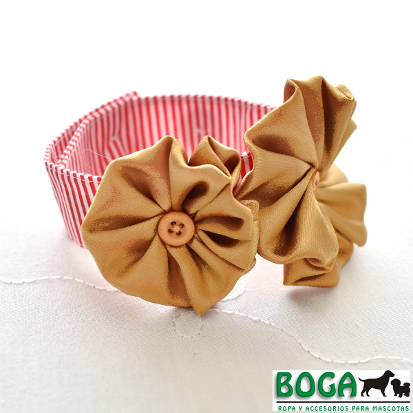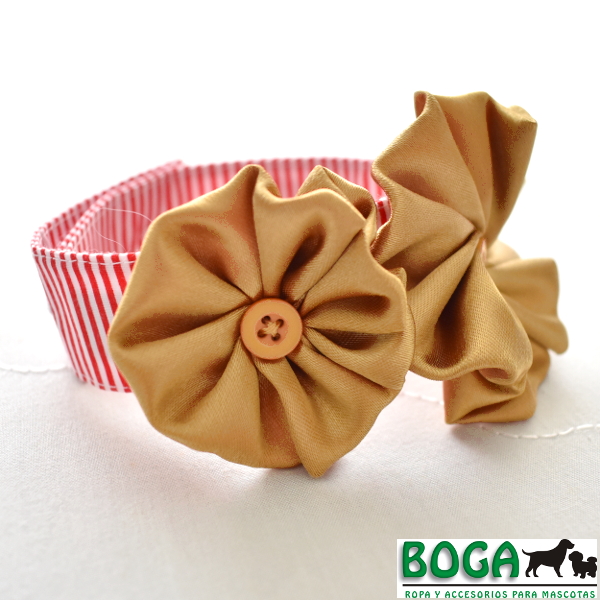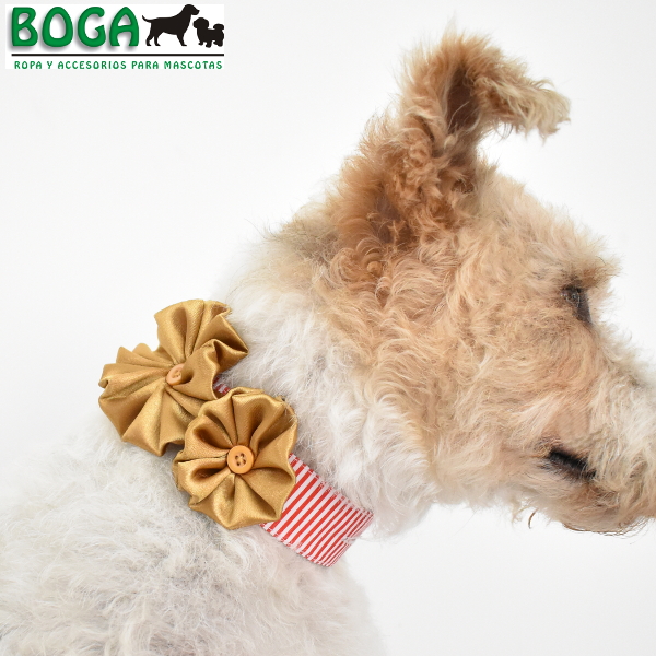 Lindo y elegante collar de tela, ideal para las celebraciones navideñas de Diciembre. Collar a rayas rojo y blanco con un par de flores doradas. Disponibles en 4 tallas, ajustables con 3 botones a lo largo para que se acomoden mejor al cuello de tu engreído. Medidas referenciales: 'S' para cuellos de 17 a 27cm, 'M' de 24 a 34cm, 'L' de 33 a 46cm, 'XL' de 44 a 56cm.